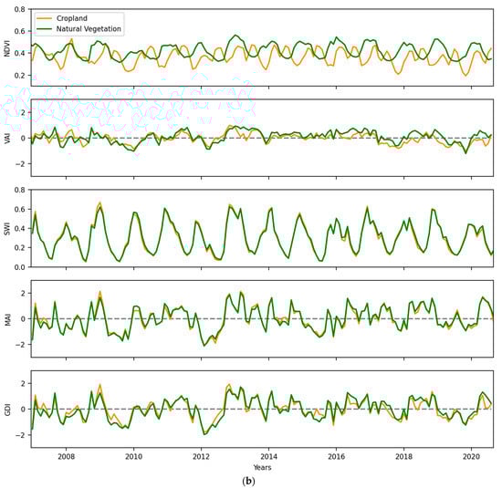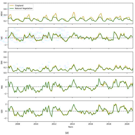 At the Kairouan site (Figure 10a), the trends of the two indices seemed to be strongly correlated for both land cover types in cropland and natural vegetation. In fact, at this site, the type of rainfed agriculture explained this correlation between the water stock in the soil and the dynamics of the vegetation cover. On the other hand, at the irrigated site in Andalusia (Figure 10b), strong differences were first observed between the two types of land cover linked to different vegetation cycles. The MAI and VAI also showed different trends. This result could be explained by the effect of irrigation on the dynamics of the vegetation cover, independent of the actual rainfall context. In this context, the application of the GDI index aims to consider the effects related to vegetation and soil water content through the combination of VAI and MAI.