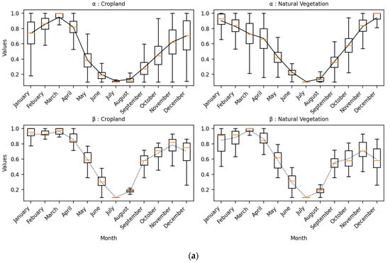 For the former, slight discrepancies between the different weights proposed for the two types of cover were observed. This result was related to the rainfall context of this study area and the different spatial resolutions of the two remote sensing products used. In Kairouan, the alpha cycles were similar between cropland and natural vegetation; however, some differences were observed. In particular, 50% of the boxes were much smaller for the natural vegetation between October and January, which illustrates more variability during this period when the start of the agricultural season with the first cereal seeding was very variable between farmers and more variability from one year to another due to rainfall.