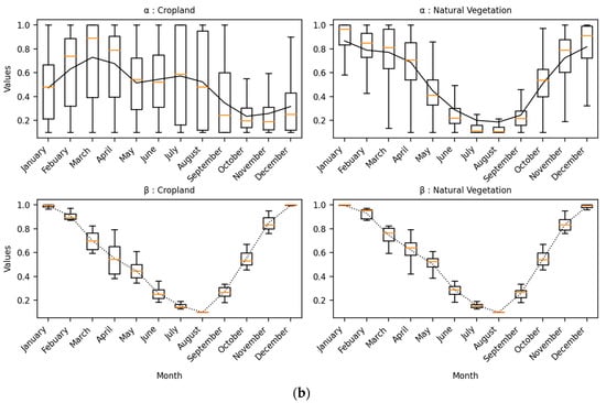 In Kairouan (Figure 11a), variations in α and β were rarely above 0.2 for cropland and natural vegetation; however, α showed wide variation for Andalusia croplands, probably due to the high percentage of irrigated areas and intense crop rotations, while α variation for the natural vegetation areas remained under 0.2. Slight differences in the weights existed in autumn and spring. The Andalusia site (Figure 11b) illustrates additional uncorrelated relationships between canopy dynamics and water content stock, particularly due to irrigation in agricultural areas. A higher dispersion of β was observed in the months of March and April, suggesting that the low-resolution remote sensing product of soil moisture could identify the impact of irrigation. In this framework, weights α and β are only correlated in the case of natural canopies.