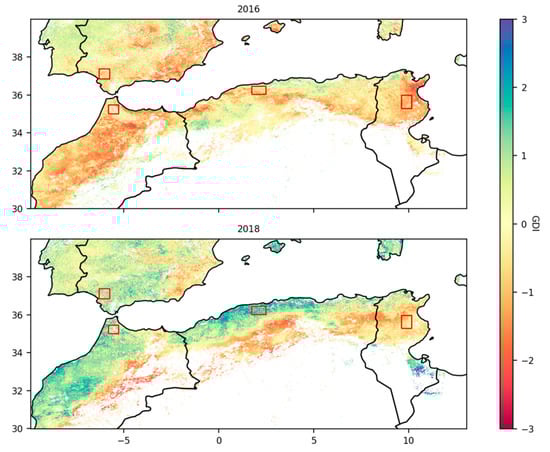 Figure 12 illustrates the mapping of the GDI with the proposed weights described in Equations (5) and (6) in March 2016 (dry year) and March 2018 (wet year). The patterns were approximately similar to those in the VAI maps of Figure 6. However, compared to the VAI map, the new map accentuates the effect of drought in 2016 on the entire study region. It also shows a wetter index in 2018. As noted, with GDI, we have a drought map that combines the effects of drought on vegetation and on the water content in the soil. For example, on the Andalusia site, we observe a context with a positive GDI index in 2018 when it was negative with the VAI index. This is explained by a positive MAI index level as illustrated in Figure 10.