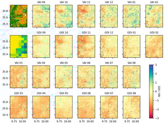 When we look closely at the sites of Kairouan (Figure 13) and Andalusia (Figure 14), for example, during the entire hydrological year 2015–2016, which was particularly dry, we observed approximately the same spatial trends between the two indices VAI and GDI. However, the intensity of the indices was not the same. We observe similar behaviors during the summer dry season. On the other hand, during the other seasons, the intensity of the drought was not the same. The difference is more marked on the highly irrigated Andalusia site, sometimes with an intensification of the drought index as observed in autumn and inversely at the end of spring.