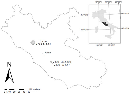 This study was carried out in three warm monomictic volcanic lakes located in the Latium region, Italy: Lake Albano, Lake Bracciano, and Lake Nemi (Figure 1).