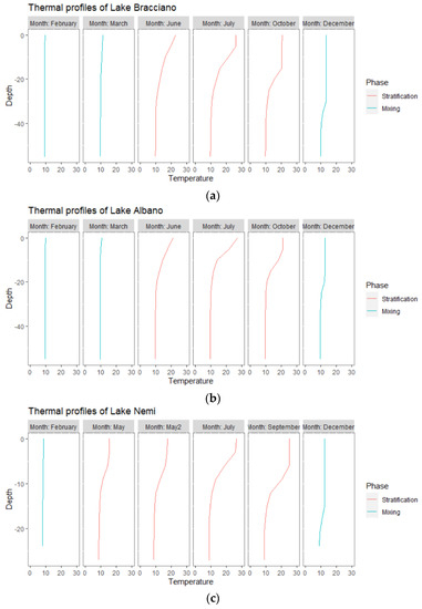 Based on the temperature data of the water column collected by the Regional Agency for Environmental Protection of Lazio (ARPA Lazio), in all three lakes, the seasonal thermal stratification for the year 2019 started in spring, in agreement with findings from previous studies reporting similar trends [42,45]. According to the water circulation phases, chlorophyll concentration data were grouped as follows (Figure 2): mixing from November to April, stratification from May to October.