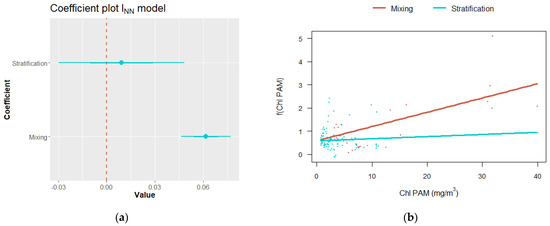 (a) Coefficient plot of the linear mixed model designed with the index based on the MDN algorithm (IMDN). Dots represent coefficient estimates; the outer error bars are 95% confidence intervals and the inner error bars are 50% confidence intervals. The 95% coefficient interval for stratification includes zero, which indicates a non-significant relationship between measured and predicted chlorophyll content. (b) Plot of the interaction effect between Chl concentration and water circulation phase.