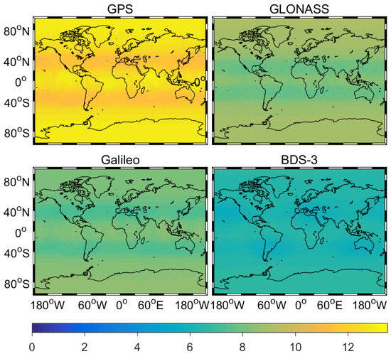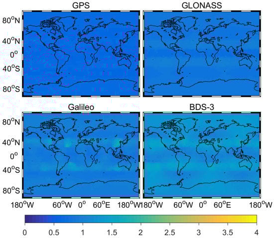 Figure 1 and Figure 2 show the average distribution of time dilution of precision (TDOP) and number of satellites for GPS, GLONASS, Galileo, and BDS-3 on DOY 265–266, 2019. From two figures, we can conclude two interestingly findings. First, BDS-3 and Galileo can provide globe service from the TDOP values and the satellite number. Second, the average TDOP values and number of satellites are (0.62, 0.82, 0.94, 1.21) and (12.32, 8.47, 7.93, 6.32) for GPS, GLONASS, Galileo, and BDS-3, respectively. The number of BDS-3 satellites is a little less than that of Galileo at current state.