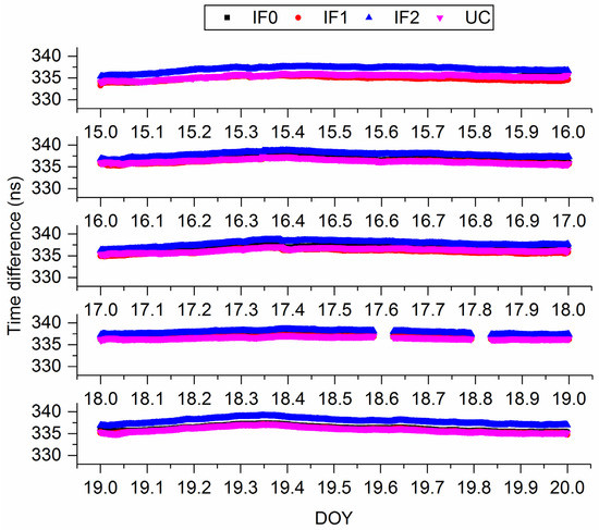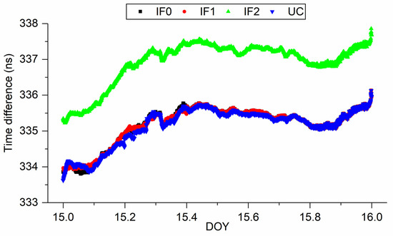 Figure 3 presents the time difference of XIA3-BRCH with BDS-3 IF0, IF1, IF2, and UC PPP models. Note that the difference has absorbed the hardware delay. The time series of IF0, IF1, and UC match each other very well. However, there is a clear system bias between IF2 and other models, which reflects the UCD at receiver end (see Equation (19)). In addition, the trends of time series obtained by different models are nearly consistent. For a clearer surface of our findings, we enlarge some of results in Figure 3 and present them in Figure 4. From Figure 4, we can further prove our previous findings. To further quality our results, from DOY 15 to 19, the standard deviation (STD) values are (0.54, 0.43, 0.47, 0.30, 0.60) ns, (0.49, 0.44, 0.46, 0.26, 0.62) ns, (0.59, 0.48, 0.51, 0.36, 0.64) ns, and (0.51, 0.44, 0.43, 0.26, 0.61) ns, respectively, for IF0, IF1, IF2, and UC models. Hence, we can conclude that four kinds of BDS-3 PPP time transfer models exhibit the same performance.