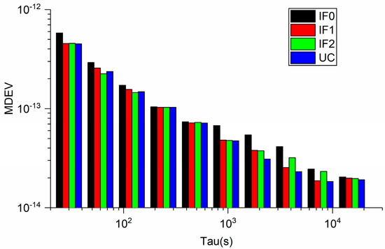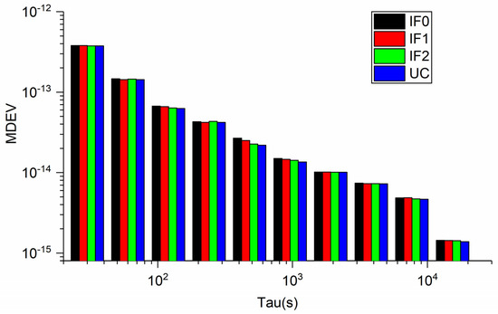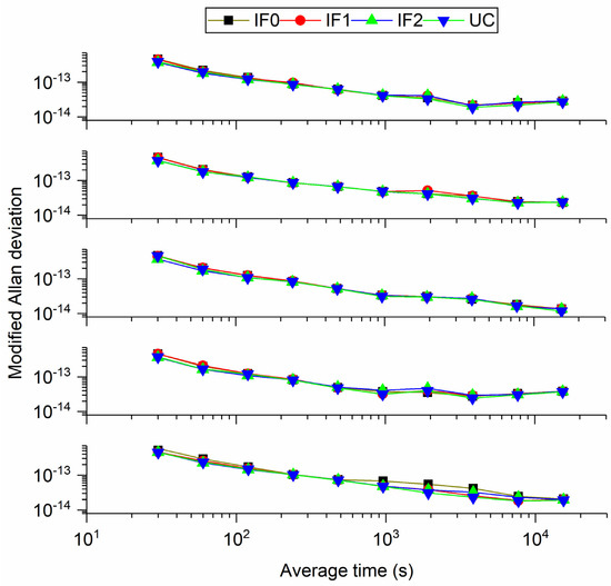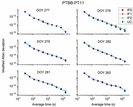 Figure 11 and Figure 12 display the MDEV of different models for BRUX-PT11 and PTBB-PT11 time-links. Obviously, the frequency stability is the same for four precise time transfer models. For the common clock experiment, actually, the MDEV of time series of PTBB-PT11 exhibits the noise and variations of the UCD and observations. We can see that the MDEV of six continuous days present the same variation. To show our results more clearly, Figure 13 and Figure 14 present the MDEV of different models for BRUX-PT11 and PTBB-PT11 time-links on DOY 277, 2019. The frequency stability at 30 s and 15,360s outperforms (3.9948 × 10−13, 3.9117 × 10−13, 3.9848 × 10−13, 3.92891 × 10−13) and (4.8298 × 10−15, 3.2336 × 10−15, 3.2903 × 10−15, 3.0274 × 10−15) for BRUX-PT11 obtained from IF0, IF1, IF2, and UC model, respectively. In addition, the frequency stability at 30 s and 15,360 s are (3.8044 × 10−13,3.7898 × 10−13, 3.7668 × 10−13, 3.7603 × 10−13) and (1.4392 × 10−15, 1.4301 × 10−15, 1.4294 × 10−15, 1.3864 × 10−15) for PTBB-PT11 obtained from IF0, IF1, IF2, and UC model, respectively. Obviously, we can see that quad-frequency Galileo has the same conclusions as quad-frequency BDS-3 PPP models.