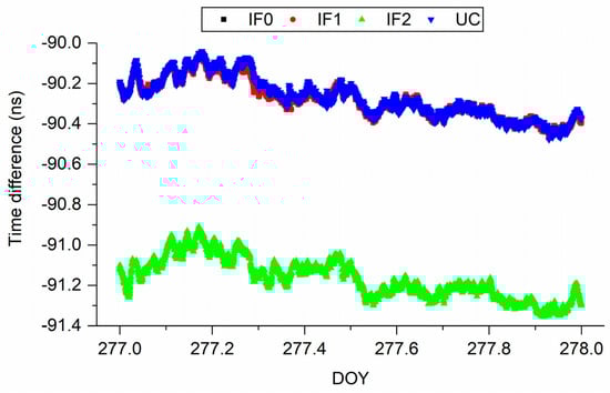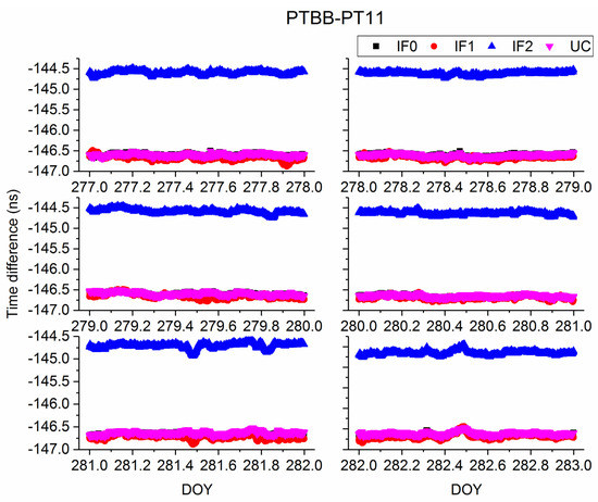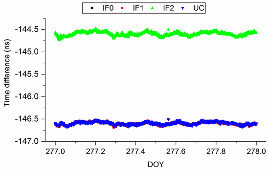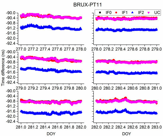 Figure 7 and Figure 8 present the time series of time difference obtained from different Galileo precise time transfer models on BRUX-PT11 and PTBB-PT11. In addition, time difference of BRUX-PT11 and PTBB-PT11 obtained from four models on DOY 277, 2019 is displayed in Figure 9 and Figure 10, respectively, for clearly presentation. Note that the receivers at PT11 and PTBB are connected to the common clock at PTB. We can conclude two findings here. First, similar to the above conclusions, Galileo IF0, IF1, and UC agree well with each other. Second, IF2 time series is different from the other models, which is relative to the UCD. To further study the characteristic of Galileo precise time transfer model, we calculated mean and STD values of time series obtained from IF0, IF1, IF2, and UC models and listed in Table 5 and Table 6. From DOY 227–282, the mean values are (−90.28, −90.46, −90.57, −90.77, −90.85, −90.79) ns, (−90.29, −90.42, −90.60, −90.77, −90.86, −90.79) ns, (−91.17, −91.34, −91.44, −91.65, −91.74, −91.68) ns, and (−90.27, −90.44, −90.57, −90.78, −90.87, −90.81) ns for IF0, IF1, IF2, and UC models, respectively, on BRUX-PT11 time-link. The STD values are (0.1, 0.03, 0.09, 0.05, 0.05, 0.06) ns, (0.09, 0.04, 0.11, 0.05, 0.06, 0.08) ns, (0.1, 0.03, 0.09, 0.05, 0.06, 0.07) ns, and (0.1, 0.03, 0.09, 0.05, 0.05, 0.06) ns, for IF0, IF1, IF2, and UC models, respectively, on BRUX-PT11 time-link. For a common clock experiment (PTBB-PT11), the mean values are (−146.6, −146.61, −146.6, −146.66, −146.66, −146.63) ns, (−146.67, −146.66, −146.65, −146.69, −146.72, −146.68) ns, (−144.6, −144.62, −144.59, −144.63, −144.7, −144.65) ns, for IF0, IF1, IF2, and UC models, respectively. The STD values are (0.03, 0.03, 0.03, 0.03, 0.03, 0.04) ns, (0.05, 0.04, 0.06, 0.04, 0.05, 0.06) ns, (0.04, 0.04, 0.05, 0.04, 0.05, 0.05) ns, (0.03, 0.03, 0.04, 0.03, 0.03, 0.04) ns for IF0, IF1, IF2, and UC models, respectively. Therefore, we obtain the second conclusion that quad-frequency Galileo precise time transfer models show the same performance. In addition, the quad-frequency Galileo PPP time transfer performance present a slightly better than that of BDS−3. There are several possible explanations for this result. First, the accuracy of BDS−3 orbit and clock products need to be further improved. Second, the TDOP values of Galileo satellite system is less than that of BDS-3. Third, the DCB values of BDS-3 we are currently used is just a preliminary file and has not yet been officially released. Besides, an unknown system bias exists in the IF2 model, so we do not recommend users to use this model for time transfer (See the mean values).