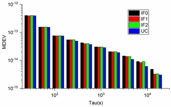 The frequency stability can be used to verify precise time transfer performance in another way. Here, the modified Allan deviation (MDEV) method is employed to assess the frequency stability. Figure 5 exhibits the modified Allan deviation (MDEV) values of the time differences, obtained from four kinds of BDS-3 precise time transfer models between BRCH and XIA3 stations at different time intervals. As shown in Figure 5, the MDEV of different precise time transfer is comparable to each other. At 30 s average time (frequency stability in short-term), the frequency stabilities are (5.7869 × 10−13, 4.5378 × 10−13, 4.5589 × 10−13, 4.8072 × 10−13) for IF0, IF1, IF2, and UC model on DOY 15, 2019, respectively. Frequency stability are (2.0471 × 10−14, 2.589 × 10−14, 1.9685 × 10−14, 1.9147 × 10−14) at 15,360 s average time (frequency stability in long-term) on DOY 15, 2019. We can conclude that the performance of quad-frequency PPP is equal to or better than that of dual-frequency PPP both for short- and long- term frequency stability. This finding can also be proved by Figure 6 (enlarged figure), which exhibits MDEV between different BDS−3 PPP models (DOY 15) on XIA3-BRCH time-link.