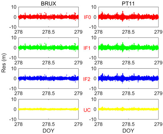 Figure 15 illustrates the residuals of pseudorange observations at BRCH and XIA3 stations of BDS-3 IF0, IF1, IF2, and UC PPP models on DOY 16. Figure 16 demonstrates the residuals of pseudorange observations at BRUX and PT11 stations of Galileo IF0, IF1, IF2, and UC PPP models on DOY 278. Four findings can be concluded here. First, the pseudorange residuals are basically close to zero. It suggests that our DCB estimation and correction method is right. Second, the residuals of UC model are smaller than ionospheric-free models. It seems possible that these results are due to low noise amplification (see Table 1 and Table 2). Third, for BDS-3 pseudorange residuals may be affected by the preliminary DCB file. Fourth, the pseudorange residuals of Galileo quad-frequency precise time transfer is obviously smaller than that of BDS-3. These differences can be explained by the fact that the orbit and clock products, DCB values and number of BDS-3 satellites need to be further improved.