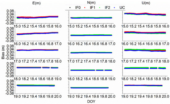 Second, BDS-3-only or Galileo-only IF1, IF2, and UC models agree well with each other due to the same performance of positioning accuracy and tropospheric delay. However, we do not recommend time users to use IF2 models. This result may be explained by the fact that an unknown system bias exists in the IF2 model. Besides, IF2 model will be not used due to the absence of particular frequency. In addition, the receiver DCB values obtained from BDS-3 or Galileo quad-frequency PPP models vary stable.