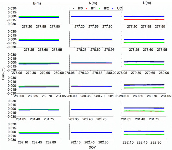 For time users, the station coordinates are commonly estimated as a constant or constrained to improve receiver clock offset estimation. To fully study the quad-frequency precise time transfer method, the selected station coordinates were estimated as unknow parameters. Figure 17 and Figure 18 exhibit the positioning error for different BDS-3 or Galileo PPP models on XIA3 and BRUX stations, respectively. Note that the precise receiver coordinates of PT11, BRCH, XIA3 are calculated by Bernese 5.2 software with IGS final products to assess the positioning accuracy. To further quantify positioning accuracy, the root mean square (RMS) of positioning error for BRCH and XIA3 stations with BDS-3 different PPP models and for BRUX, PT11, PTBB with Galileo different PPP models are listed in Table 7 and Table 8. The mean RMS values of BDS-3 IF0, IF1, IF2, and UC models at BRCH station are (1.61, 0.46, 0.52, 0.77) cm, (0.78, 0.34, 0.63, 0.67) cm, and (2.54, 2.46, 2.40, 2.38) cm at east (E), north (N), up (U) components, respectively. At XIA3 station, the mean RMS values are (2.12, 2.22, 2.14, 1.93) cm, (0.61, 0.29, 0.34, 0.55) cm, and (3.45, 3.46, 3.35, 3.31) cm at E, N and U components. For Galileo precise time transfer models, the RMS values of IF0, IF1, IF2, and UC models at BRUX station are (0.39, 0.15, 0.17, 0.35) cm, (0.21, 0.21, 0.17, 0.11) cm, and (0.92, 0.96, 1.03, 0.88) cm at E, N and U components. For PTBB station, the mean RMS values are (0.26, 0.45, 0.17, 0.14) cm, (0.18, 0.23, 0.17, 0.17) cm, and (1.22, 0.87, 0.88, 0.78) cm at E, N and U components. Hence, both BDS-3 and Galileo quad-frequency PPP time transfer models can reach few centimeters level about station coordinates parameters.