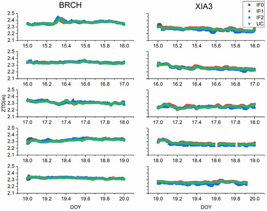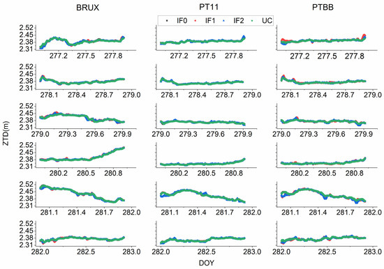 For quad-frequency precise time transfer methods, the zenith troposphere delay parameter was treated as random walk noise. Figure 19 and Figure 20 depict the troposphere delay estimated by BDS-3 or Galileo different PPP models, respectively. To further quantify the accuracy of troposphere delay parameter, the values obtained from Bernese 5.2 with IGS final products are further employed to assess troposphere delay. The RMS values are calculated and listed in Table 9 and Table 10. The mean RMS values for BRCH and XIA3 are (1.10, 1.08, 1.09, 0.94) cm and (1.87, 1.97, 1.97, 1.91) cm for BDS-3 IF0, IF1, IF2, and UC PPP models. For Galileo IF0, IF1, IF2 and UC PPP models, the mean RMS values are (0.72, 0.86, 0.83, 0.69) cm, (0.67, 0.75, 0.72, 0.63) cm, and (0.68, 0.82, 0.82, 0.64) cm for BRUX, PT11, and PTBB stations. Thus, for BDS-3 and Galileo different models, there is no obvious difference for ZWD (see Table 9 and Table 10).