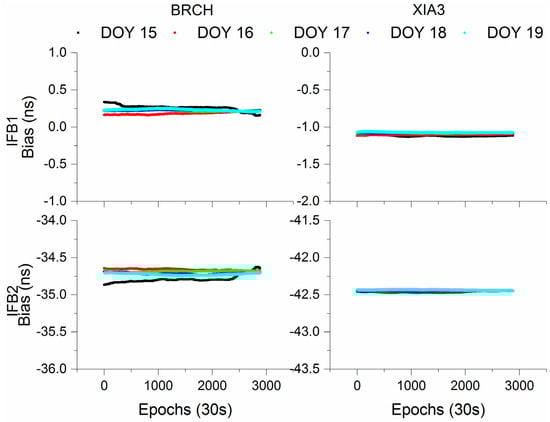 For BDS-3 IF1, IF2 and UC model, there are one, one and two additional IFB parameters (see Equations (7)–(22)), which are related to the receiver after satellite DCB correction. Here, we will just show IFB parameters obtained from UC model at XIA3 and BRCH, which depicts at Figure 21. The mean STD values of IFB values are (0.018, 0.006) ns for BDS-3 UC models at BRCH and XIA3 stations, respectively. Hence, we can conclude that the IFB parameters are very stable during the whole day.
