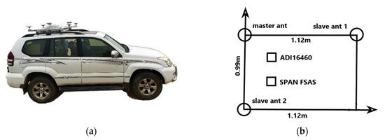 The experimental platform is equipped with 3 GNSS receivers (Septentrio Mosaic-×5, Leuven, Belgium) with a sampling frequency of 1 Hz; A low-cost MEMS IMU (ADIS-16460) and a high-precision tactical grade IMU (SPAN FSAS) are installed. Their gyroscopes’ specifications are shown in Table 1. Three GNSS antennas are used on the roof of the car, forming two baselines of 1.12 m (Baseline 1, BL1, aligned in driving direction) and 0.99 m (Baseline 2, BL2, right-angled to BL1). The equipment setup in is shown in Figure 2. The GNSS base station, set up in the center of the experiment area, uses the Trimble Net R9 receiver and measurement antennas, and the sampling frequency is 1 Hz.