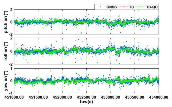 As shown in Figure 10, the availability of GNSS mode attitude determination is very poor, while the TC and TC-QC mode have continuous and stable performance. In Table 3, the accuracy of attitude determination in GNSS mode is 3.167, 3.344, and 6.773 degrees for yaw, pitch and roll, respectively, which is far worse than that (0.13, 0.25, and 0.29 degrees) in the friendly environment. This is because many epochs fixed the ambiguity wrongly, leading to false attitude results far from the true value. This proves that attitude determination based on GNSS alone is unreliable in harsh environments.