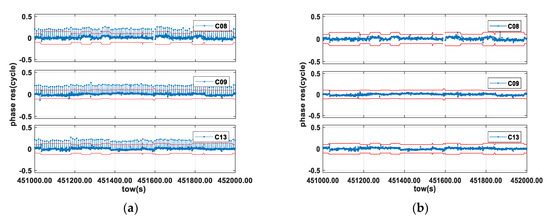 To evaluate the ability of the MAQC method to detect outliers, we chose the three satellites C08, C09, and C13 observed in baseline 1 as examples, and the reference satellite was C06. Figure 5a shows the predicted residuals of carrier observations over time. Figure 5b shows the predicted residuals of the double difference phase observations passed through the MAQC method. The red line is the threshold line. It can be seen that the original phase residuals contain some half-cycle slips and multi-path errors. When using the MAQC method to eliminate the observations containing large bias, the phase residuals become stable and smooth.