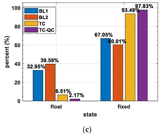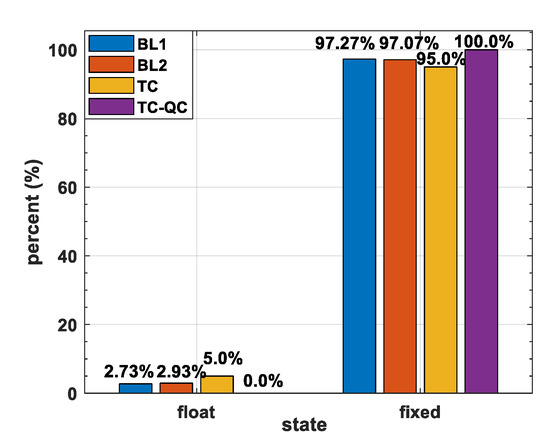 To compare the ambiguity resolution success rates of the three modes, we take the ratio test as the standard: when the ratio is greater than 3, it is assumed that the ambiguities are correctly fixed. Based on this judgement, the ambiguity resolution success rates of the BL1 and BL2, TC mode and TC-QC mode can be counted (see Figure 7).