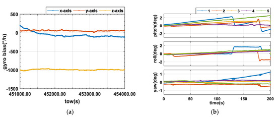 The time series of three gyro bias estimated axes are plotted in Figure 8a. It shows that the gyro biases of the three axes are about (300, 90, 1000)°/h. If the gyro bias of the z-axis is not compensated, it is easy to predict that the angle drift of z-axis can reach about 30 degrees in 2 min and lead to a huge attitude error. Assuming that the z-axis gyro bias is well compensated, and the residual bias is about 24°/h, three times the nominal bias stability (8°/h, 1), it can be predicted that a 2 min outage will lead to an accumulated attitude error of 0.8 deg.