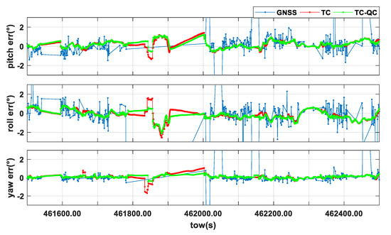 In TC mode, the errors of the heading, pitch, and roll angles are 0.298, 0.462, and 0.408 degrees, respectively. Compared with GNSS mode, it is reduced by 90% or more, which is a significant improvement. The attitude accuracy of the TC-QC mode is further improved compared to that of the TC mode. Especially in the heading angle, the RMS reduced from 0.321 degrees to 0.196 degrees. Figure 10 shows the feature that the mainly improvement of TC-QC mode is when the GNSS observation environment is very bad or unavailable.