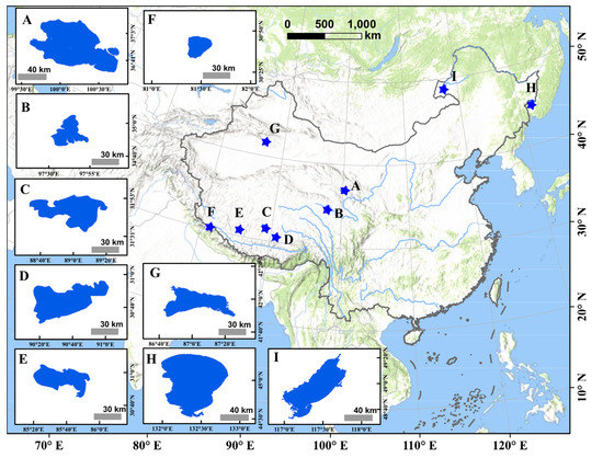 The locations of the selected lakes. (A) Lake Qinghai; (B) Lake Ngoring; (C) Lake Silingco; (D) Lake Namco; (E) Lake Zharinamco; (F) Lake Mapang; (G) Lake Bosten; (H) Lake Xinkai; and (I) Lake Hulun.