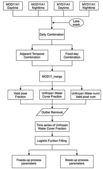 The automated detection of lake ice phenology from MODIS daily temperature data was performed in three main steps (Figure 2): (i) the MODIS data from Terra and Aqua were combined to increase data availability, (ii) the unfrozen water cover fraction was extracted to characterize the spatial-temporal change pattern of water/ice transition, and (iii) a curve-fitting model was applied to capture the ice phenology characteristics in transitional periods. The individual steps of the method are presented in the following sections.