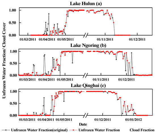Outliers in the unfrozen water cover fraction were mainly caused by the high percentage of cloud cover, as shown in Figure 3. The outliers were eliminated by the following steps. First, the unfrozen water cover fraction was set to 1 for dates before the mean air temperatures in autumn dropped below 0 °C. The mean air temperature values were preliminarily smoothed by a 31-day running average to remove synoptic variability [52]. Second, the unfrozen water cover fraction was removed if the percentage of “invalid” pixels in an image was larger than 80%. After outlier removal, the temporal pattern of the unfrozen water cover fraction (increase or decrease) was applied to describe the water/ice transition process and then extract lake ice phenology.
