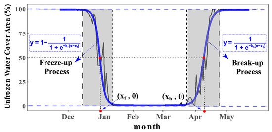 where is the unfrozen water cover fraction at time ; is the maximum value of the unfrozen water cover fraction, which is equal to 1 in our study; is the rate of curvature at the inflection point, referred as in the freeze-up process and in the break-up process; is the days of the hydrological year, is the time at a given inflection point, referred to as in the freeze-up process and in the break-up process; and and are the fitting parameters and represent the curvature and position of function, respectively. The logistic function was similar to the cumulative normal distribution and has two key fitting parameters ( and ) representing the curvature and position of the function on the time axis, respectively.