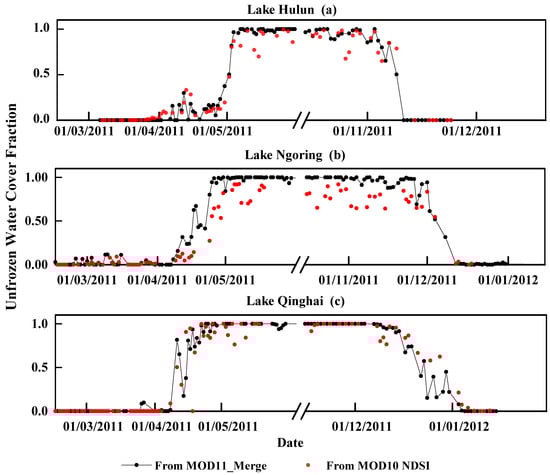 Comparison of unfrozen water cover fractions in Lake Hulun, Lake Ngoring, and Lake Qinghai from MOD11_Merge temperature images and MODIS snow product data, taking the year 2011 as an example.
