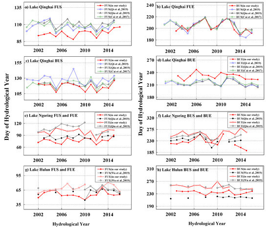 Comparison of lake ice phenology dates between our study (the right y-axis) and other studies (the left y-axis) in Lake Qinghai (a–d), Lake Ngoring (e–f), and Lake Hulun (g–h). The lake ice phenology dates extracted in our study are shown as dotted lines. The y-axis is the day of the hydrological year (1 September is referred to as Day 1 in our study).