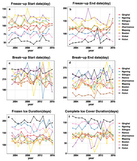Temporal changes in lake ice phenology variables from 2002 to 2016. (a) Freeze-up day; (b) freeze-up rate; (c) break-up day; (d) break-up rate; (e) duration of frozen ice cover; and (f) duration of completed ice cover.