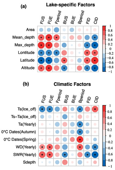 Correlation maps between lake ice phenology variables and climatic (a) and lake-specific factors (b). Red indicates a positive correlation, and blue indicates a negative correlation. The size of the circle represents the absolute value of the correlation coefficient. The * represents significance at a confidence level of 0.1. Ts (ice_off) is the lake water surface temperature during the ice-off period, and Ta (yearly) is the annual mean air temperature. The 0 °C dates (autumn/spring) represent the dates at when air temperature reached 0 °C in the autumn/spring. WD (yearly) and SWR (yearly) represent the annual mean wind speed and shortwave solar radiation, respectively.