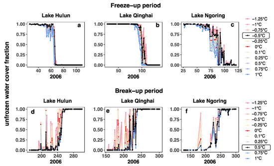 The temporal pattern of the unfrozen water cover fraction was calculated using different freezing and melting temperatures of pixel settings. (a–c) Freeze-up pattern, and (d–f) break-up pattern. The colored lines indicate the unfrozen water cover fraction indices based on the corresponding freezing (melting) temperatures of pixels.