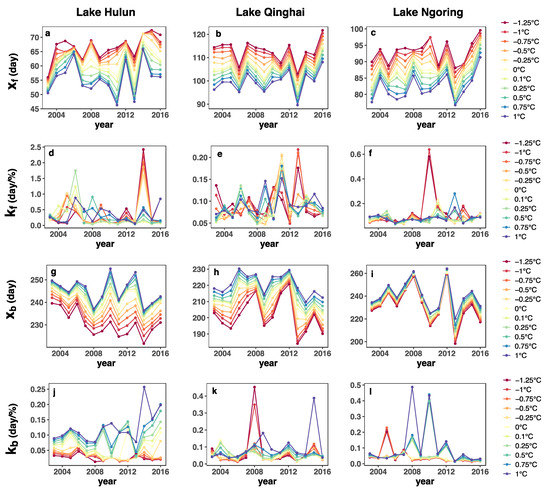 The sensitivity of the water/ice classification status to the threshold value was evaluated by a lake ice phenology extraction under different freezing and melting temperatures, which was varied in 0.25 °C intervals within the range from −1.25 °C to 1 °C. Figure 10 shows the temporal pattern of the ice fitting variables ( and , and and ) among the three lakes, under different freezing and melting temperature settings. Consistent fluctuations were found in the interannual variabilities in and . The variabilities in and were relatively stable except when the temperature threshold was too high or too low (Figure 11). As shown in Figure 10a–c, the freeze-up process occurred earlier when the freezing temperature was set higher. The temporal pattern of the unfrozen water cover fraction was stable and consistent when the freezing temperature was set between −0.75 °C and 0.5 °C. The break-up process showed relatively high variability in the initial phase, especially when the melting temperature was set lower than 0 °C (Figure 10d–f). This variability was possibly due to the melt-refreeze events captured when the temperature setting was too low, which were not representative of the starting point of the actual break-up process.
