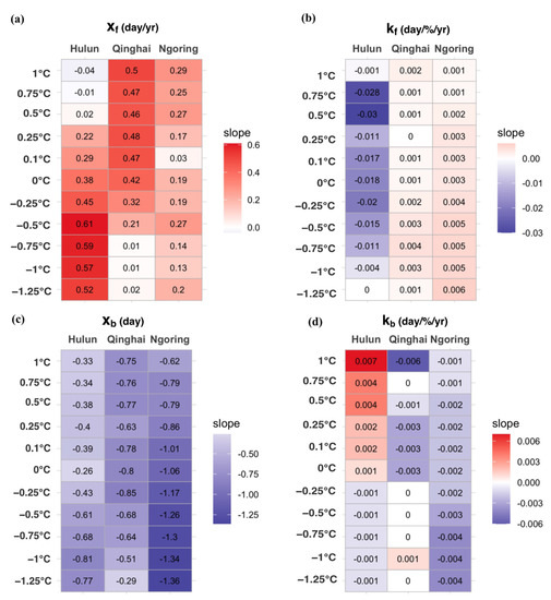 (a–d) The ice phenology variable trends under different freezing and melting temperatures of pixel settings. The x-axis is the lake, and the y-axis is the trend of the unfrozen water cover fraction. The red and blue tiles indicate positive trends and negative trends, respectively.