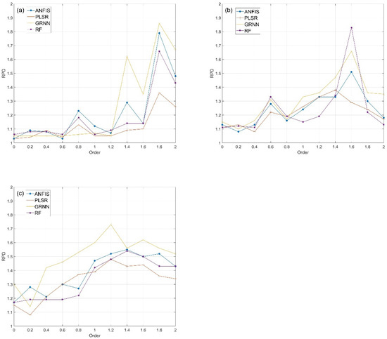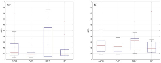Boxplot of RPD versus heavy metal concentration estimation results using partial least squares regression (PLSR), random forest (RF), adaptive neural fuzzy inference system (ANFIS) and generalized regression neural network (GRNN) of (a) Hg, (b) Cr, (c) Cu.