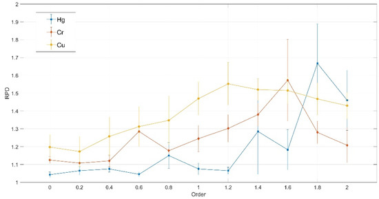 In order to intuitively demonstrate the influence of FOD on the estimation of heavy metals, the RPDs of models were drawn in line charts (Figure 3). The model with 1.8-order and the GRNN method achieved the best performance in the estimation of Hg, the model with 1.6-order and the GRNN method achieved the best performance in the estimation of Cr, and the model with 1.2-order and the RF method achieved the best performance in the estimation of Cu. Among 12 lines, 4 lines peaked at 1.8-order, 3 lines peaked at 1.6-order, 3 lines peaked at 1.4-order, and 2 lines peaked at 1.2-order. To further elucidate the effect of FOD, the error bar of three heavy metals was formed based on the RPD of models, as shown in Figure 4. For Hg and Cr, the accuracy of models varied little between 0-order and 1-order. For three heavy metals, the accuracy of the models using any method improved greatly between 1.2-order and 1.8-order, and decreased greatly at 2-order. In addition, the variances of model accuracy for Hg and Cr were larger between 1.4-order and 1.8-order.
