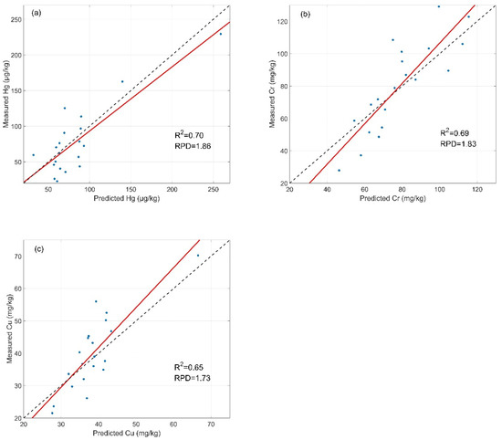 Scatterplots illustrating the optimal accuracy of (a) Hg, 1.8-order reflectance generalized regression neural network (GRNN) model; (b) Cr, 1.6-order reflectance random forest (RF) model; (c) Cu, 1.2-order reflectance GRNN model. The black dotted lines represent 1:1 lines, and the red solid lines represent the regression lines.