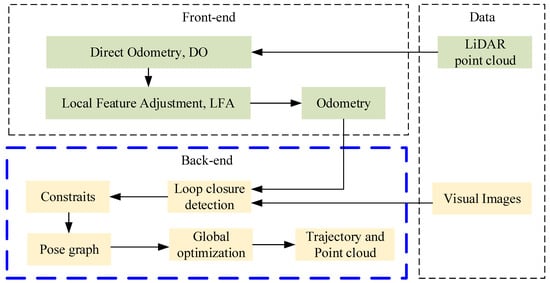 The core of SLAM is to utilize sensors, i.e., a camera and LiDAR, to perceive the environment and estimate states, i.e., position and attitude []. Generally, a typical SLAM includes two parts: a front-end odometer and a back-end optimization []. The front-end odometer estimates the state and maps the environment. The back-end optimization corrects the cumulative errors of the front-end odometer and improves the state estimation accuracy. In the back-end optimization, loop closure detection is also included for improving the performance of the back-end optimization. Traditionally, SLAM technology is divided according to the employed sensors, i.e., visual SLAM employs cameras as the sensor, while LiDAR SLAM utilizes LiDAR as the sensor to scan the environment [,,,,,,]. Researchers have conducted numerous investigations on the above-mentioned visual and LiDAR SLAM.