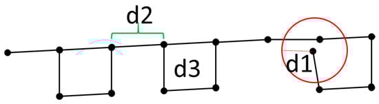 The geometric rough detection was based on the pose or odometry output by the DO-LFA, wherein we selected the preliminary candidate frames from the historical key frames and matched with the current frame to carry out loop closure detection. There are three threshold judgment conditions (Figure 3): (1) when the search area threshold d1 (red circle radius) of key frames was less than the threshold range, it might be a potential loop closure frame; (2) the interval threshold d2 must be greater than the threshold; and (3) the ring length threshold d3 should be greater than the threshold. The key frames that meet the above conditions were saved as preliminary candidate loop closure frames for further processing.