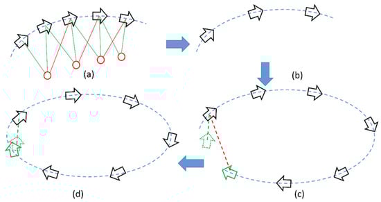 Figure 4 visually introduces the process of constructing a pose graph, where the arrow is the pose and the blue dashed line is the motion trajectory. Figure 4a presents the DO-LFA, where the red circle may be understood as overlapping point clouds or road signs for matching. The green line represents the constraint between two adjacent frames of DO. The green and red lines together represent the current frame and constraints between historical, local data. In the key frame screening, the pose nodes are reduced, and the trajectory of the DO-LFA is reserved as the constraint edge between the adjacent key frame pose nodes. Figure 4b presents the prepared frames for loop closure detection and global pose graph optimization. Figure 4c presents the loop detection process, where the green arrow represents the current frame being processed, the red dashed line indicates that the loop closure frame is found and constitutes a loop, and the green dashed line is the loop constraint edge after point clouds re-matching. Figure 4d presents the result of the optimization of the global pose graph. The pose nodes and motion trajectories are optimized, the motion trajectory forms a complete loop, and the point clouds consistency is improved.