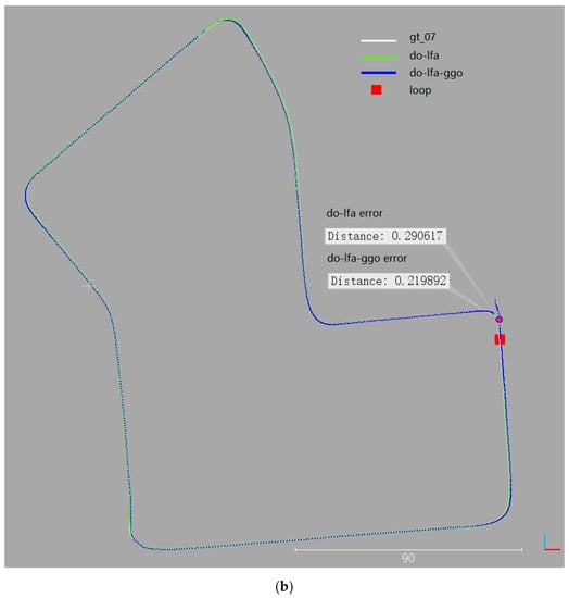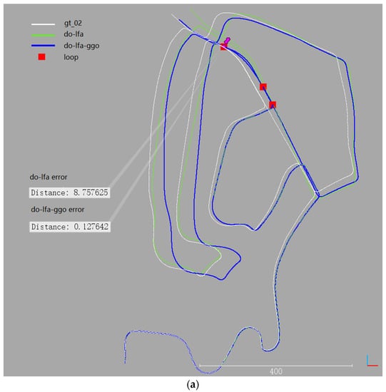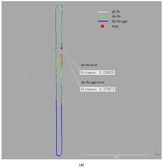 We observed that the number of loop closures detected in #01 was 5, and that they were evenly distributed on the path with an interval of about 10 m (10 m was also the threshold set for loop closure detection). It showed that the loop closure detection accuracy reached 100%. The CPE of the DO-LFA of sequence #01 was large, reaching 2.89 m. However, it dropped to 0.12 m after GGO processing. The trajectory of DO-LFA-GGO was also more accurate than DO-LFA in the loop, indicating that the GGO achieved the expected effect. The error was basically eliminated to 0.12 m of the DO-LFA-GGO from 2.89 m of the DO-LFA.
