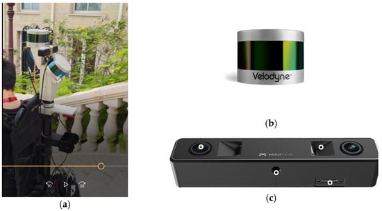 WHU Kylin backpack laser scanning platform: (a) data collecting and sensors installation; (b) Velodyne VLP-16 LiDAR; and (c) MYNT D1000-IR-120 color binocular camera.