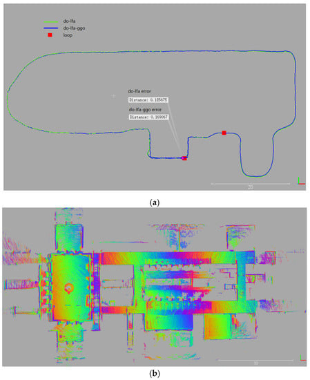 Figure 11 shows the trajectory and point clouds map of sequence #02 with and without GGO. Sequence #02 was an indoor scene of the Huawei Song Research Institute (Xibeipo Village, Songshan Lake, Dongguan) H5. Specifically, Figure 11a presents the comparison of the trajectories from the DO-LFA and DO-LFA-GGO method, while Figure 11b presents the point clouds map from the DO-LFA-GGO, noting that accuracy before GGO was already relatively high and that the point clouds were no longer compared after GGO.