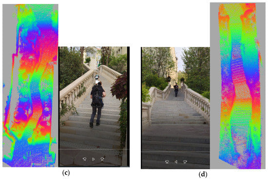 The major sensors of the WHU Kylin backpack included: Velodyne VLP-16 Lidar, Mynak D1000-IR-120 color binocular camera, Xsens-300 IMU, and a power communication module. An example of the mobile data collection is presented in Figure 9. The average speed of the backpack was 1 m/s, and the data collection and algorithm running speed were both 10 Hz. There were two LiDARs installed on the backpack. In this experiment, only the horizontal LiDAR and the left camera of the binocular camera were used, and the images were 640 × 480 respectively. The backpack was not equipped with a GPS device, so there was no true value of the trajectory. As mentioned, we consciously walk out of a relatively regular matrix area at the beginning and end of the acquisition path for accuracy evaluation. Some important threshold parameters used in the experiment were set as follows: the distance threshold and angle threshold of the key frame selection were 2 m and 10°, respectively; and the thresholds d1, d2, and d3 of the geometric rough detection were 5 m, 15 m, and 25 m, respectively.