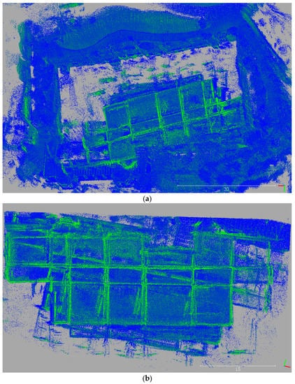 Figure 13 and Figure 14 present the point clouds results from the Cartographer with the Kylin #02 and #03 datasets. The color of the point clouds from the Cartographer were determined by the LiDAR backscatter laser intensity. Confusion and ghosts are all the result of coaxial progressive errors, and the displacement error roughly measured by the point clouds was approximately 5–10 m. The DLO-LFA-GGO in this paper detected the loop closure based on visual BoW similarity and conducted the point clouds re-matching to achieve fusion of the two data. However, the Cartographer detects the loop closure with the point clouds similarity. As a result, the point clouds from the Cartographer have severe layering and ghosting at the loop repeats, with a displacement error up to 5–10 m; while the point clouds maps from the DO-LFA-GGO have clear and accurate targets with high consistency, and the geometric CPE is only approximately 20 cm.