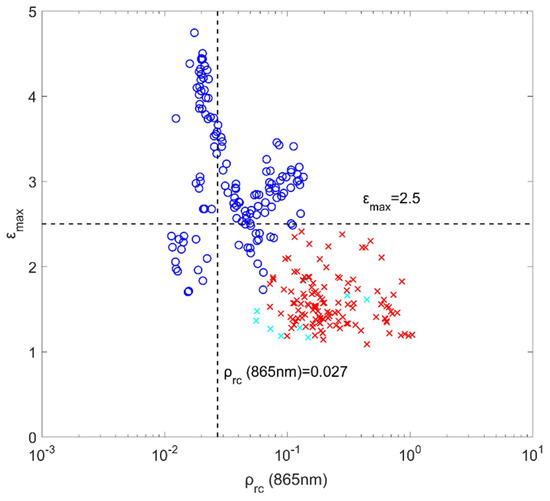 Scatter plot of versus for 136 visually selected samples as shown in Figure 3. The circles represent water samples visually selected, and the crosses represent clouds. Samples with exceeding a threshold of 0.07 are indicated in red, and those with exceeding a threshold of 1 are marked in bright cyan.