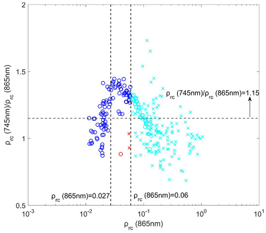 Scatter plot of versus for 136 visually selected samples as shown in Figure 3. The circles represent water samples visually selected, and the crosses represent clouds. Samples with < 1.15, , and are indicated in red, and those with exceeding a threshold of 0.06 are marked in bright cyan.