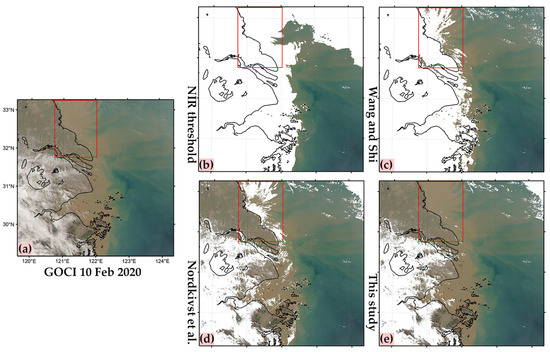 Comparison of four cloud masking methods in turbid coastal water off the mouth of Yangtze River at 05:16 (UTC) on 10 February 2020. The images are (a) the RGB image composited by GOCI-derived Rayleigh-corrected reflectance at 443 nm, 555 nm, and 680 nm; the cloud masking results using the NIR threshold method (b); Wang and Shi method (c); the Nordkvist et al. method (d); and the improved method in this study (e). Clouds are indicated as white. The red rectangle marks the turbid coastal water of Jiangsu Province of China.