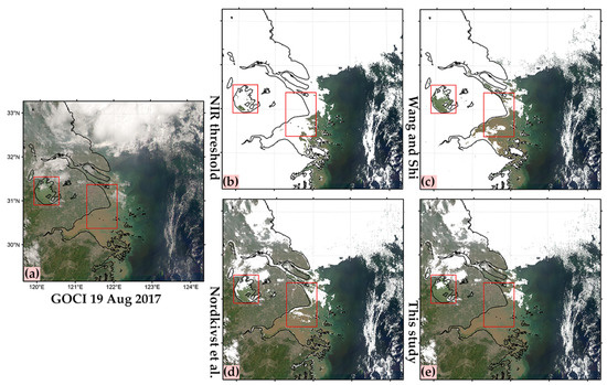 Comparison of four cloud masking methods over Lake Tai and coastal water around Hangzhou Bay of China at 01:16 (UTC) on 19 August 2017. The images of (a–e) are the same as Figure 6. Clouds are indicated as white. The smaller red rectangle (left one) marks the location of Lake Tai. The bigger red rectangle (right one) marks turbid coastal water around the mouth of Yangtze River and Hangzhou Bay of China.